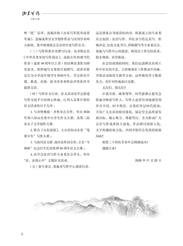 (二)写作成果选编出版行动。以年度为周期,面向全体会员广泛征集优秀作品,不限体裁,唯“优”是举,选编出版《山东写作优秀成果年编》。选编成果分文学创作作品与应用学术两大板块,集中展现我会会员的年度写作实力。