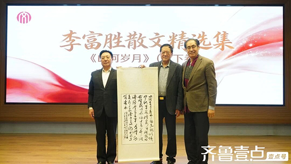 首发式研讨会最后,特别举行了赠书仪式。李富胜向威海市图书馆、威海市博物馆、文登区图书馆和山大(威海)图书馆、哈工大(威海)图书馆、威海职业学院图书馆分别赠送了散文集《山河岁月》(上下卷)及长篇小说《天边有个威海卫》、散文集《一缕清风》各5套,几家图书馆、博物馆为李富胜颁发了收藏证书。单国防和方崇民向李富胜赠送了他们联袂创作的“贺李富胜《山河岁月》付梓”诗词书法条幅。